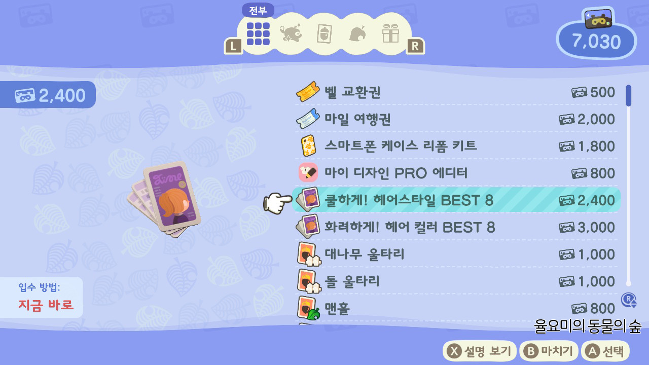모여봐요 동물의 숲에서 구입할 수 있는 헤어스타일 쿠폰은 총 3가지 인데, 먼저 발랄하게! 헤어스타일 BSTE 8, 쿨하게! 헤어스타일 BEST 8, 화려하게! 헤어 컬러 BEST 8로 구성되어 있습니다. 발랄하게! 와 쿨하게! 는 헤어스타일을 변경할 수 있으며 화려하게! 쿠폰은 헤어 컬러 변경, 즉 염색을 할 수 있는 쿠폰입니다.