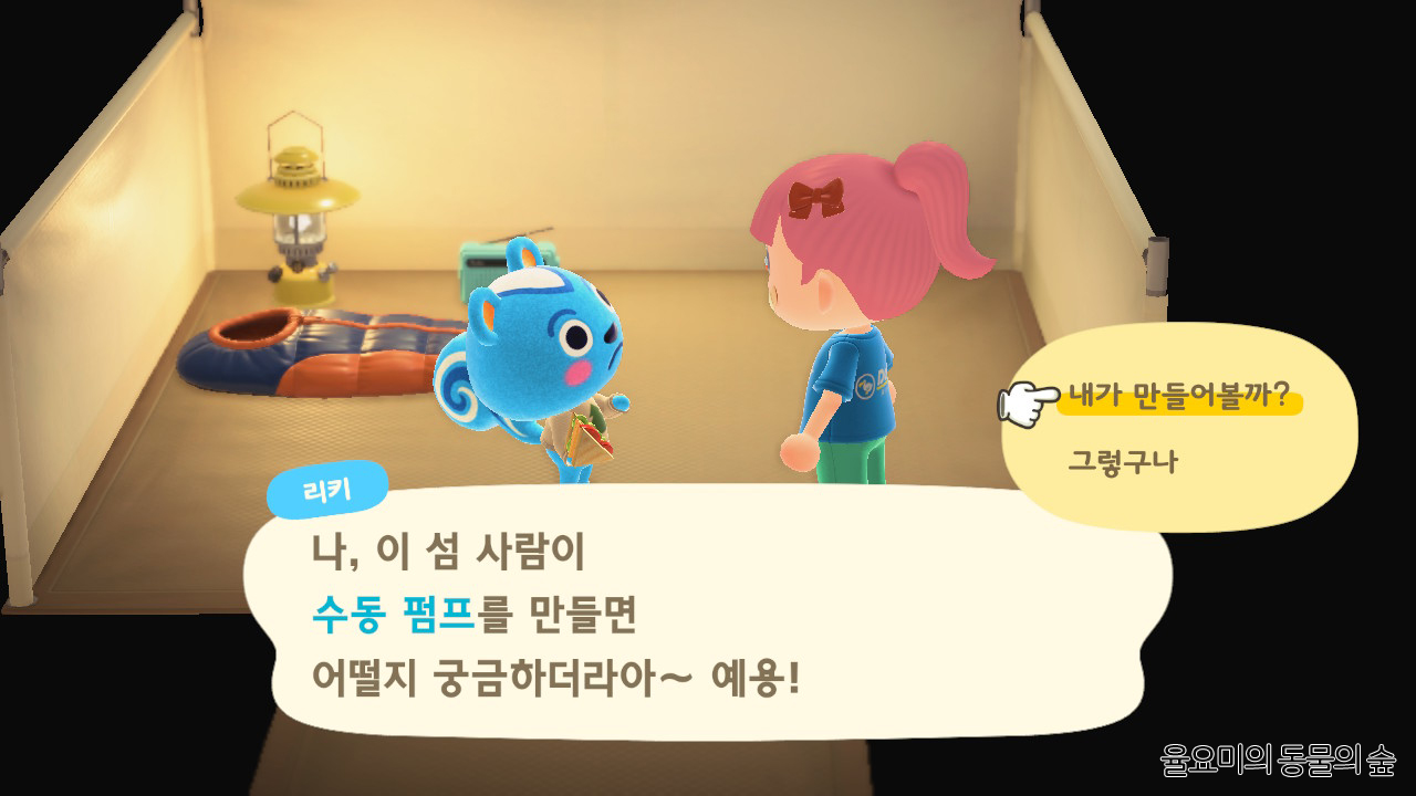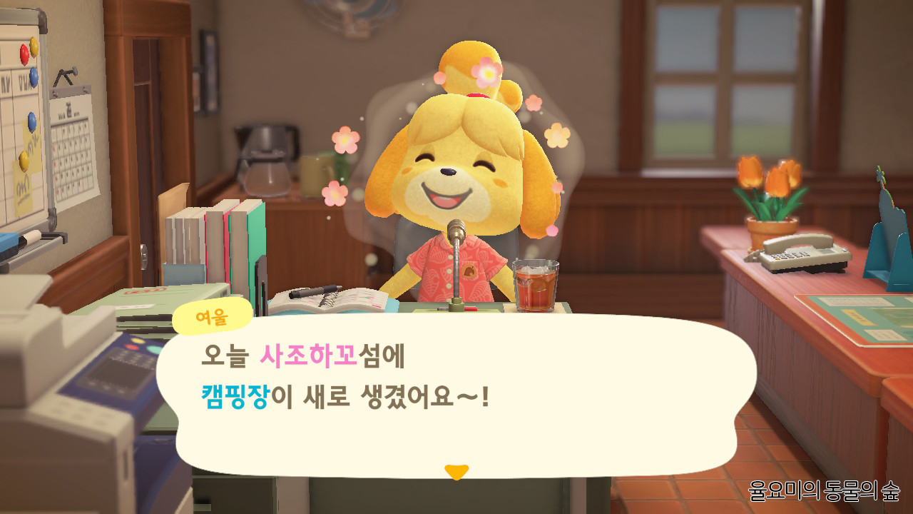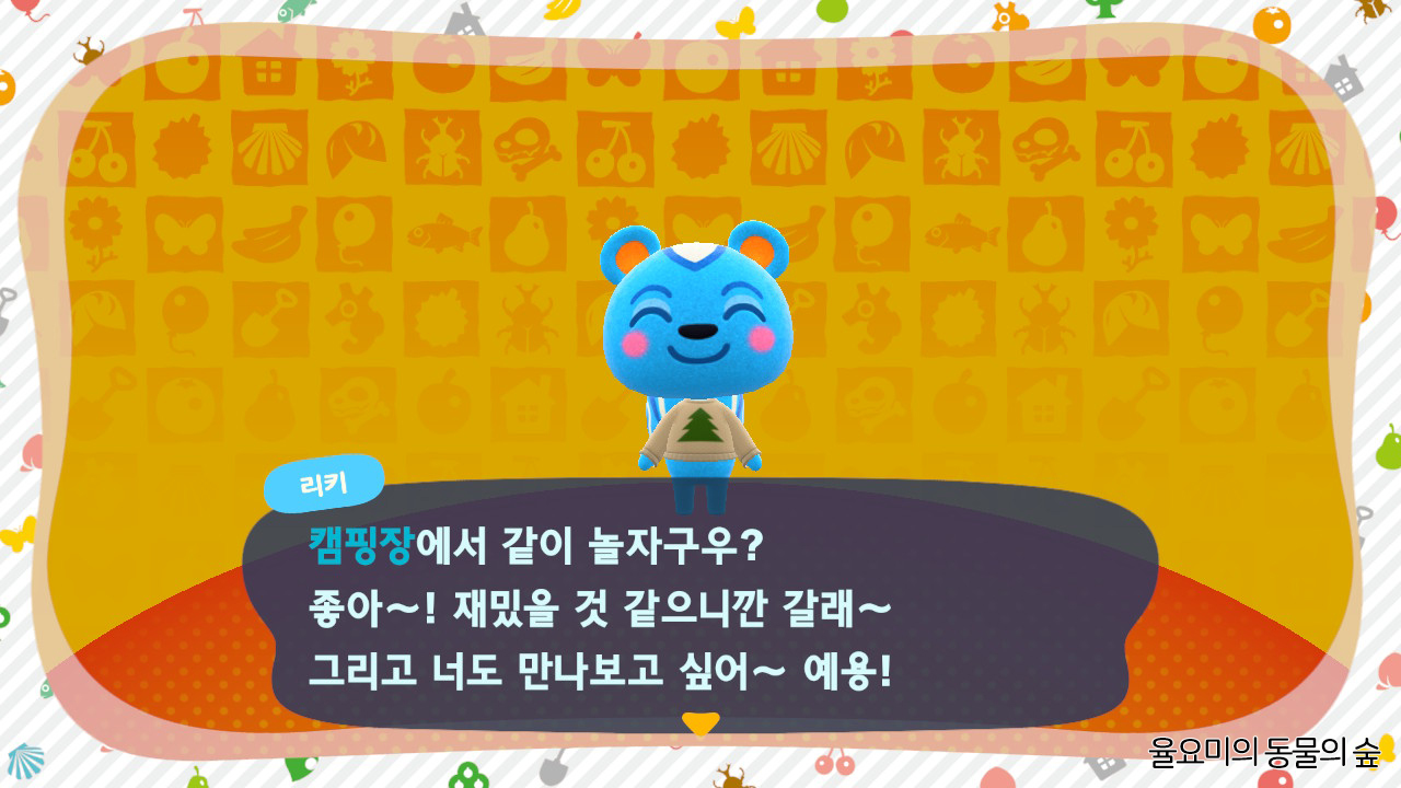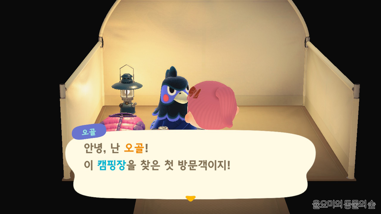 현재 나는 모여봐요 동물의 숲을 리얼 타임으로 진행하고 있다. 사실 튀동숲에서는 타임슬립을 하며 즐기는 것을 했었는데 타임슬립을 하게 되면 진행은 빠르지만 개인적으로 재미가 감소하는 느낌이었다. 그래서 모동숲을 하고 난 후로는 타임슬립을 한 번도 하지 않고 오로지 리얼타임으로 즐기고 있는데, 확실히 진행이 더디긴 하지만 훨씬 재미있고 기다림이 배가 되니 얼른 내일이 되었으면 좋겠다는 설렘까지 들 정도다. 어쨌든 드디어 나의 섬에도 캠핑장이 생겼다! 캠핑장은 초기 주민 3명 (먹보, 친절함, 아이돌)이 완전히 섬에 정착한 후 너굴 안내소의 너굴에게 캠핑장 설치 권유를 받게 되고, 캠핑장 키트 설치 후 다음날이면 캠핑장이 완성된다. 그리고 캠핑장이 완성된 다음 날에는 캠핑장에 손님이 찾아온다. 이때 웬만하면 느끼 성격을 가진 친구가 찾아온다.