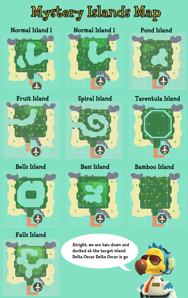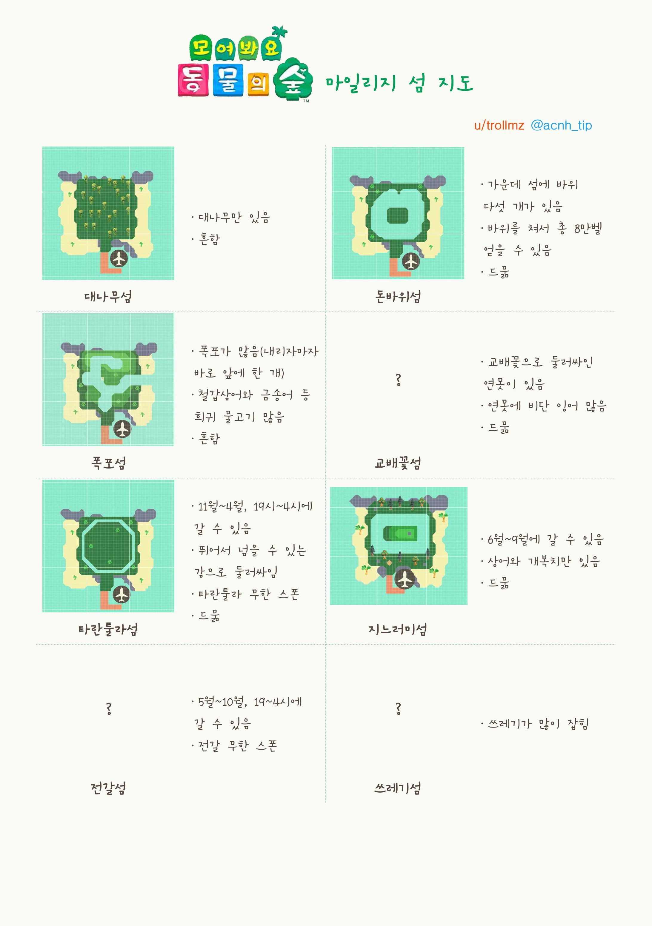 위의 지도 사진들은 외국 사이트에 있는 자료를 친절한 한국인 분이 정리해주신 자료이다. 흔하디 흔한 보통 섬, 특산물이 아닌 다른 과일이 나오는 과일 섬, 그리고 돈 바위가 가득한 돈 섬이나 타란툴라가 무한으로 나오는 타란툴라 섬까지 정말 다양하다.