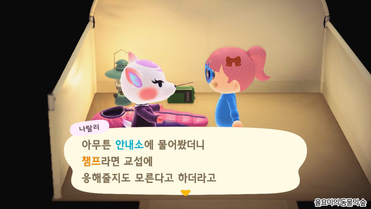 캠핑장이 열리게 되면 주민을 확인합니다. 먼저 사조하꼬섬에는 느끼 성격의 주민이 없었기에 느끼 주민 위주의 성격이 자주 왔습니다! 만약 위시 주민이 있다면 그 성격의 주민이 없는 상태에서 캠핑장 노가다를 진행해야 빨리 만날 확률이 더 높아집니다. 모든 성격의 주민이 있을 경우에는 섬 주민과 상관없이 랜덤 성격의 주민이 등장합니다.