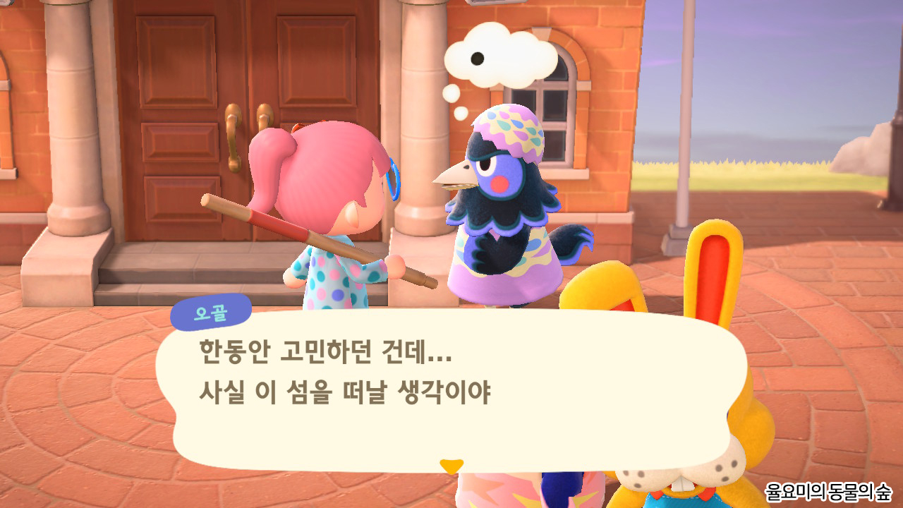 사조하꼬섬의 첫 모동숲 캠핑장 주민인 느끼 성격의 오골! 우리 섬으로 이사온지 얼마 되지 않아 이사 통보를 하였습니다. 약간의 정이 들어 살짝 고민도 하긴 했는데 나의 위시였던 잭슨을 위해 보내주기로 하였습니다. 보라색에 저 앙증맞은 볼터치가 꽤나 귀여웠는데 아쉽지만 오골과의 묘연은 여기까지 인 걸로...