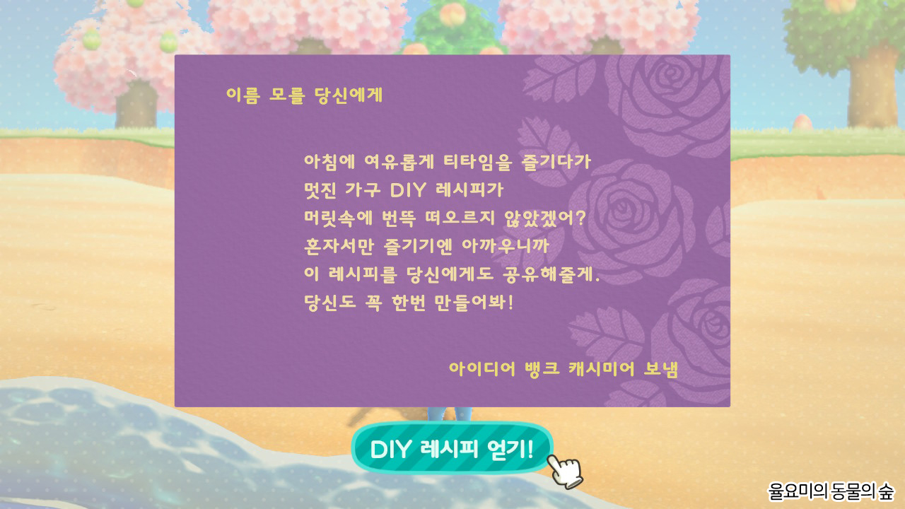 모여봐요 동물의 숲 내에서 가구나 소품, 그리고 기본으로 필요한 아이템들은 DIY 레시피만 있다면 작업대를 이용하여 DIY 하여 만들어 사용할 수 있습니다. 레시피 모으는 방법은 여러 가지가 있는데 해변가의 유리병 편지를 줍거나 DIY 하고 있는 주민에게 레시피를 받거나 또는 하늘에 날아다니는 풍선을 터트려서 레시피를 얻을 수도 있습니다. 오늘의 포스팅은 이러한 레시피를 모으는 방법들을 더 자세하게 포스팅해보려고 합니다.