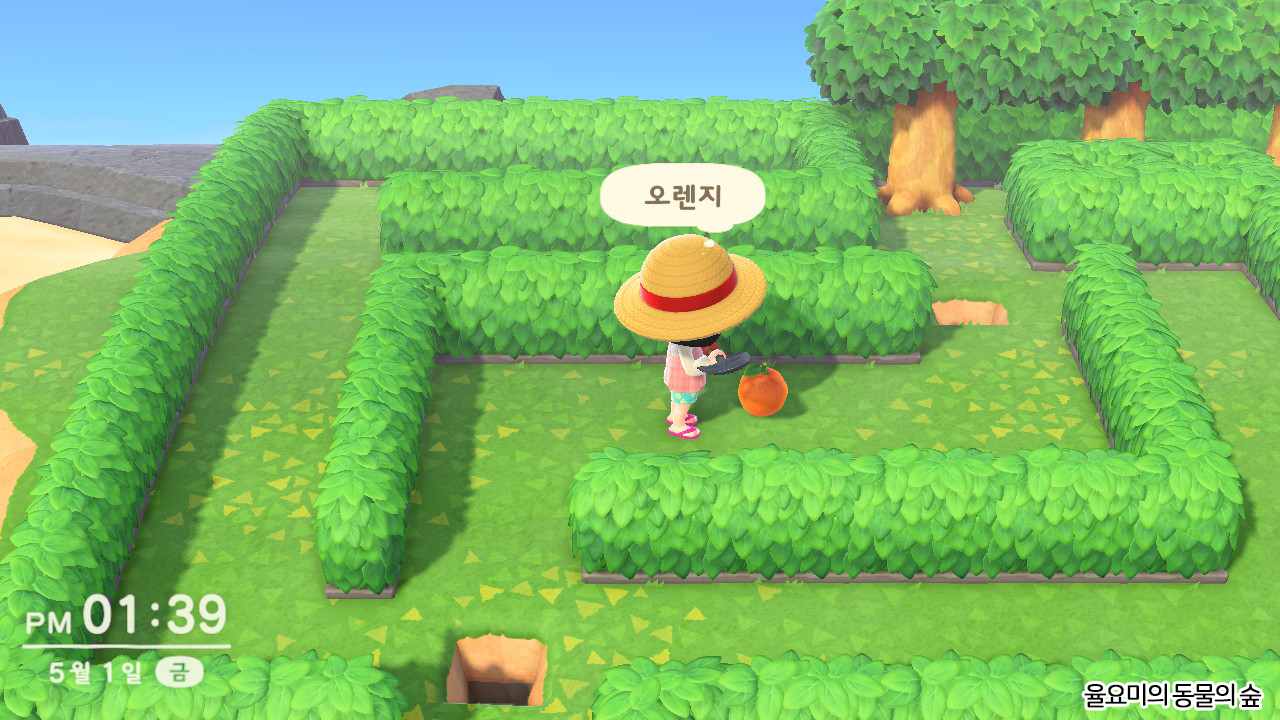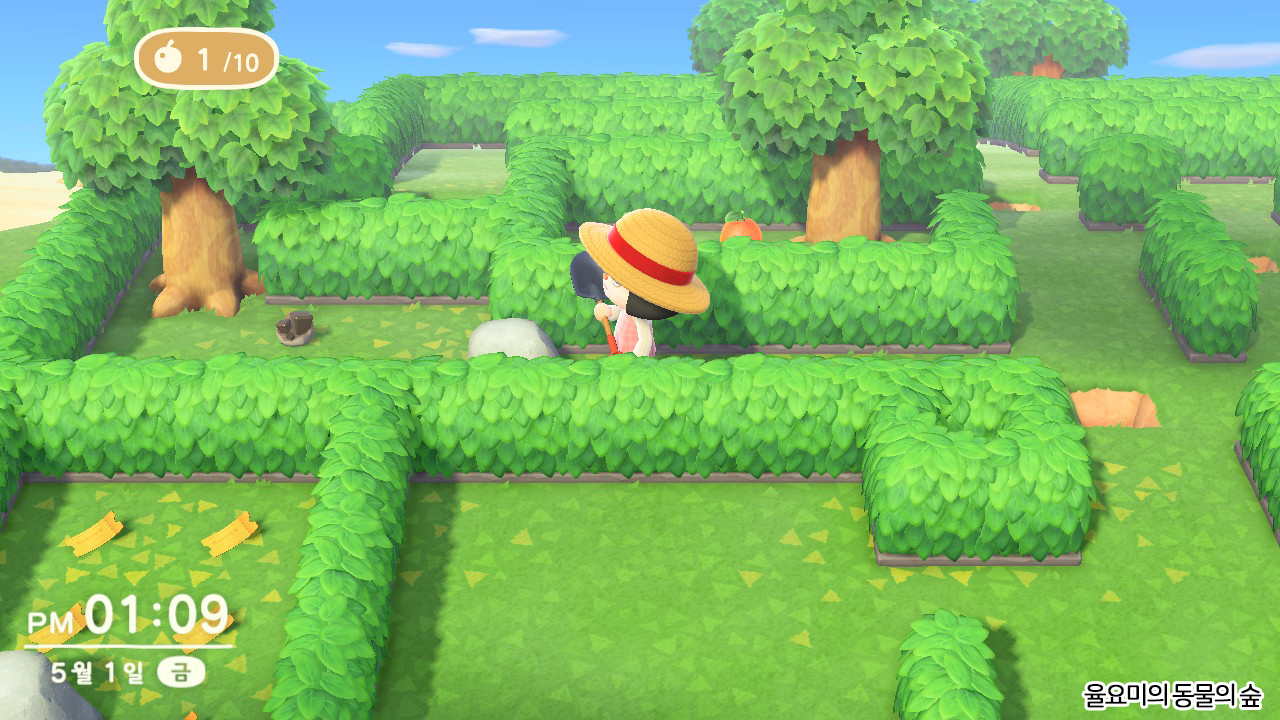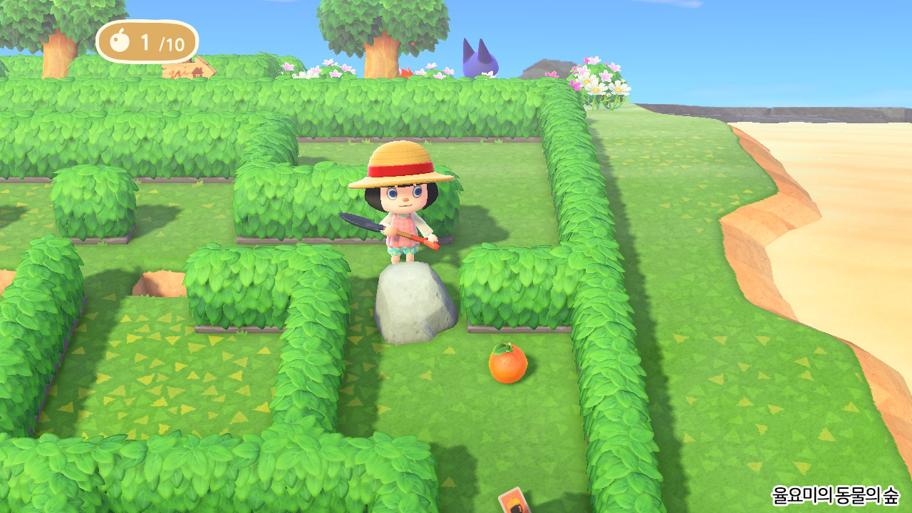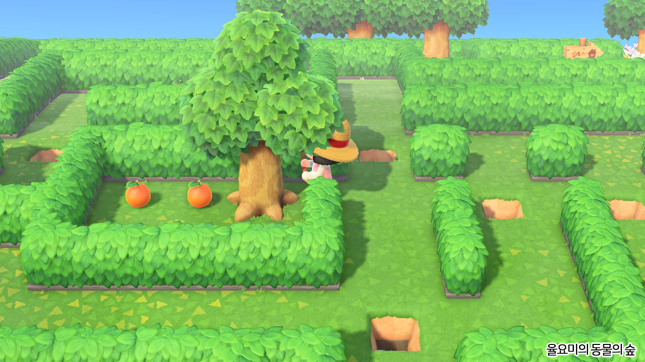 미로에 들어가게 되면 가장 먼저 삽이 떨어져있습니다. 이 삽을 주워서 사용하여 왼쪽에 있는 낮은 묘목을 없애주도록 합니다. 그다음 왼쪽 미로 안으로 들어가서 과일을 주워준 후 이동하도록 합니다. (과일은 자신의 섬의 특산물이 나옵니다.)