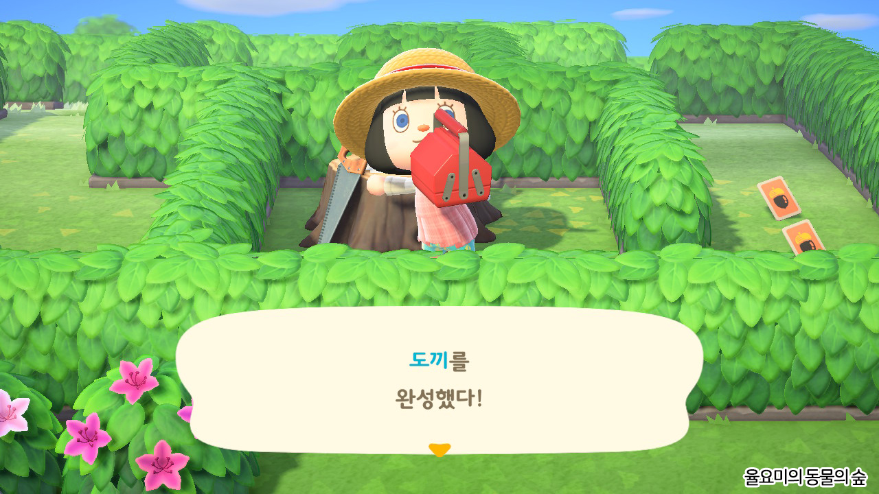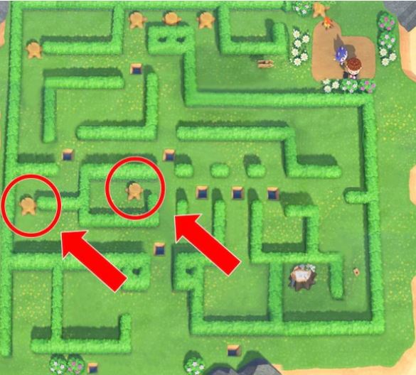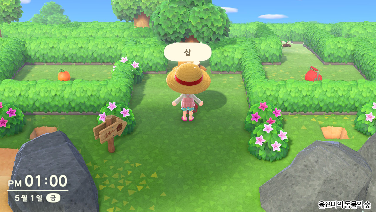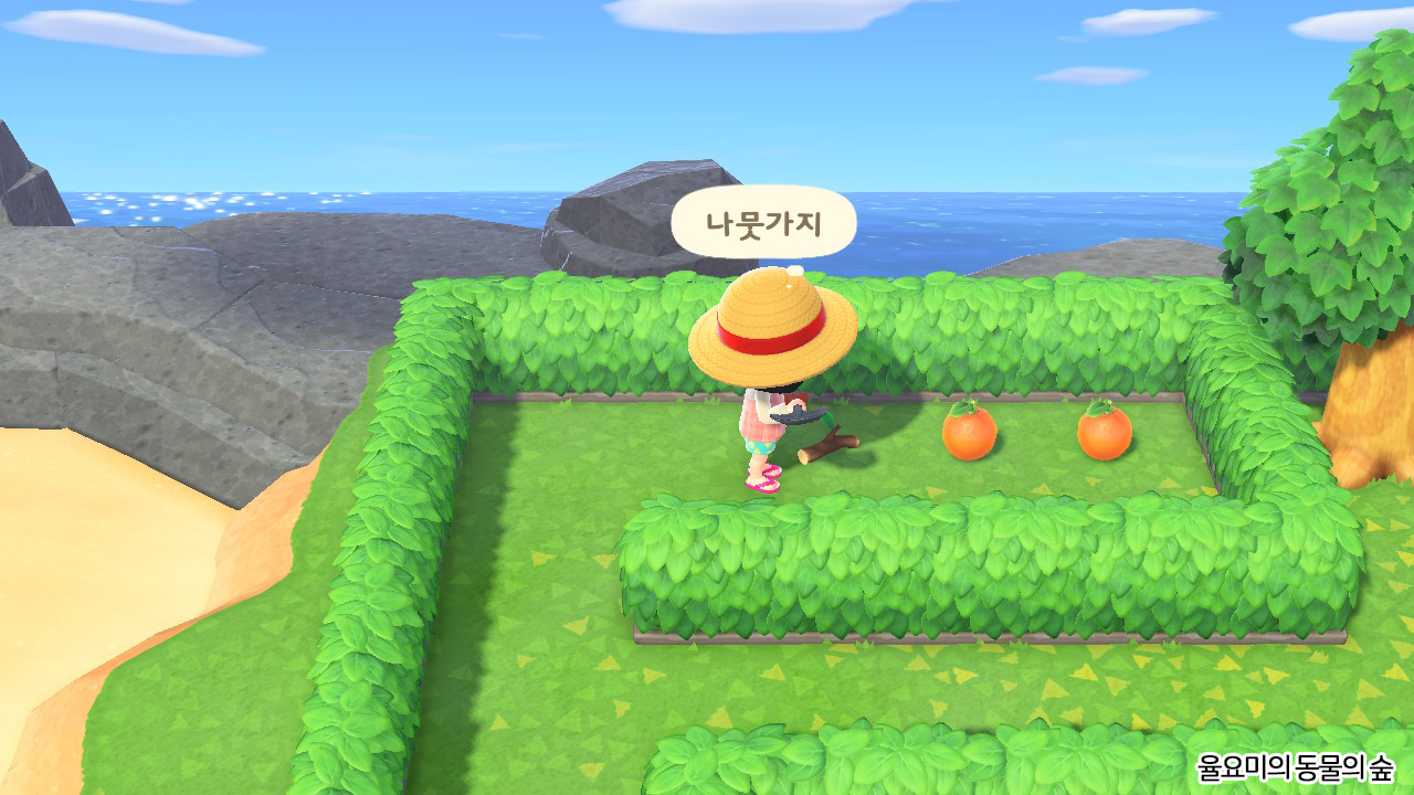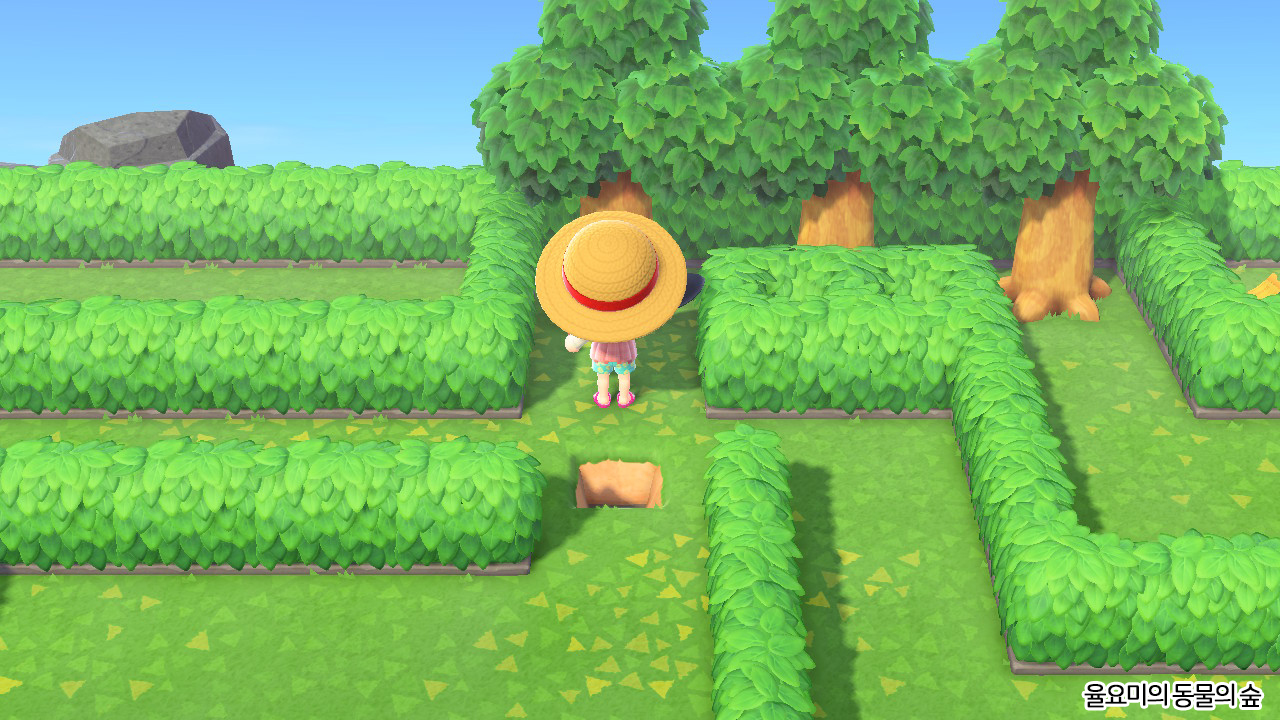 미로에 들어가게 되면 가장 먼저 삽이 떨어져있습니다. 이 삽을 주워서 사용하여 왼쪽에 있는 낮은 묘목을 없애주도록 합니다. 그다음 왼쪽 미로 안으로 들어가서 과일을 주워준 후 이동하도록 합니다. (과일은 자신의 섬의 특산물이 나옵니다.)
