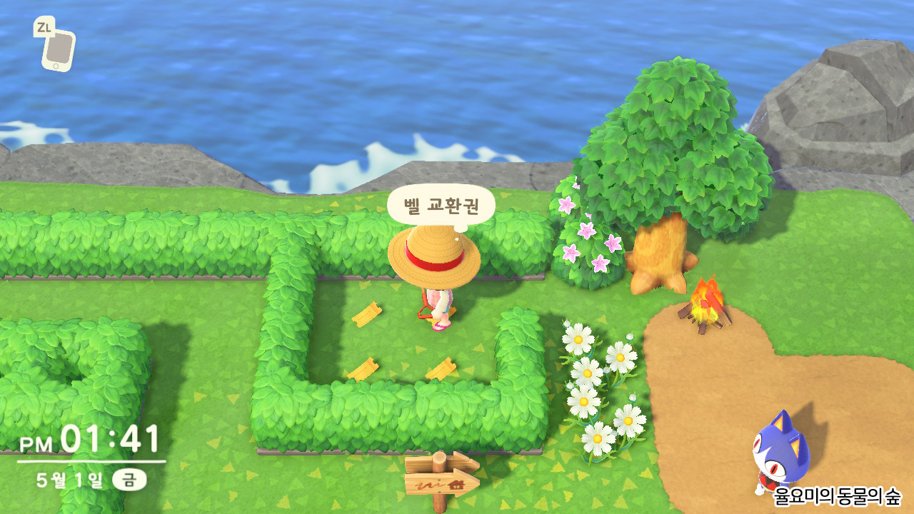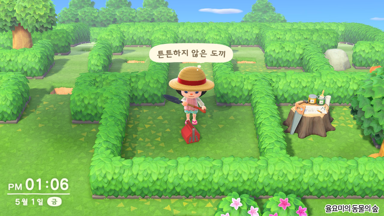 근로자의 날 이벤트 마일 섬 지도 상단에 있는 나무 3개를 도끼를 사용하여 베어준 후 삽으로 그루터기까지 완전히 없애고 나서 미로 안으로 쭉 들어가면 이번 근로자의 날 이벤트 NPC인 낯선 고양이를 만날 수 있습니다.