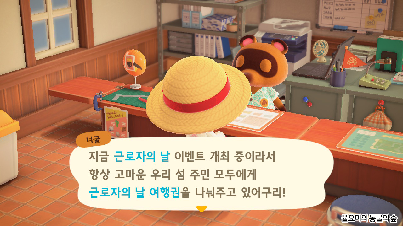 모여봐요 동물의 숲에서 근로자의 날을 맞아 주민 대표에 대한 너굴의 감사한 마음으로 근로자의 날 이벤트가 개최됩니다. 기간은 5월 1일부터 5월 7일까지 일주일 동안 진행되며 이벤트가 개최되면 너굴을 찾아가면 근로자의 날 이벤트에 대한 설명을 들을 수 있습니다.