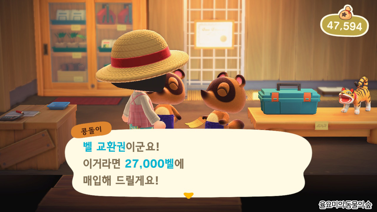 모여봐요 동물의 숲 근로자의 날 이벤트를 마치고 나면 다음 날 우편으로 낯선 고양이의 보상과 벨 교환권이 우편에 도착해 있습니다. 낯선 고양이 가방은 배치하여 인테리어 소품으로 사용할 수 있으며 벨 교환권은 너굴 상점에서 개당 3000 벨에 교환할 수 있습니다.