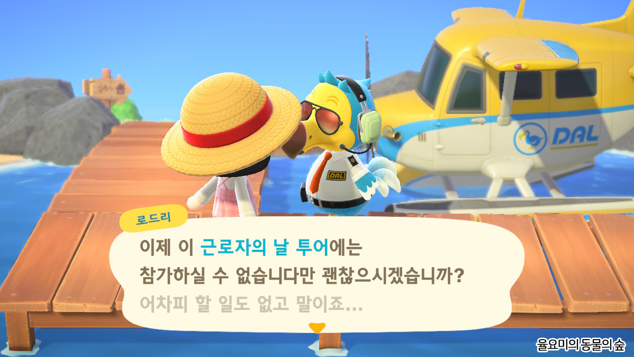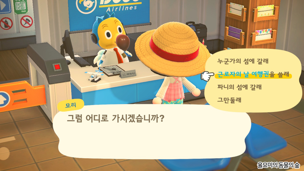 너굴에게 근로자의 날 이벤트에 관한 이야기를 들은 후 비행장에 모리를 찾아가 대화를 걸면 근로자의 날 여행권을 쓸 수 있다는 이야기를 들을 수 있습니다. 모리를 찾아가 외출할래를 선택한 후 근로자의 날 여행권을 쓸래를 선택하시면 근로자의 날 이벤트 진행을 위한 마일 섬으로 갈 수 있습니다.