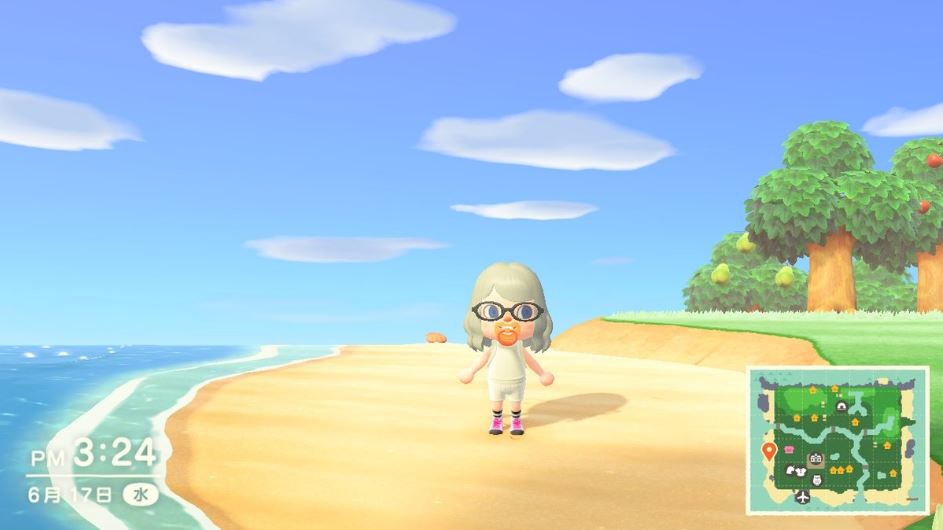 모여봐요 동물의 숲 날씨 중에서 가장 맑은 날씨일때는 구름이 조금 있는 것을 볼 수 있다. 맑은 날에는 곤충이 더 많이 돌아다니며 맑고 화창한 밝은 느낌을 준다.
