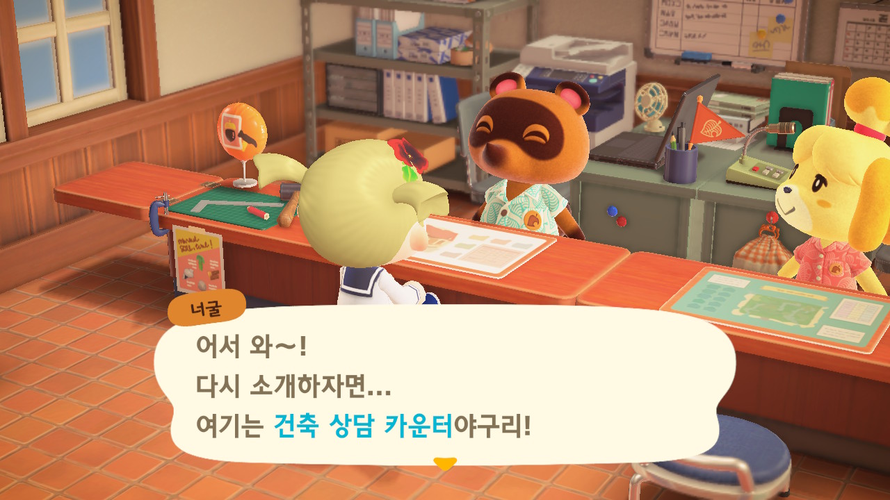 안내소는 처음부터 개방되어 있으며 초반에는 안내소와 상점의 두 가지 역할을 합니다. 튜토리얼을 진행하며 재료를 모아 너굴 상점을 건설하여 안내소와 상점이 분리되며 이후 증축이 되는 조건은 초반 3명의 주민의 이주 퀘스트를 진행하면서 세 번째 주민이 오고 다음 날에 보수공사가 시작되며 증축이 됩니다.