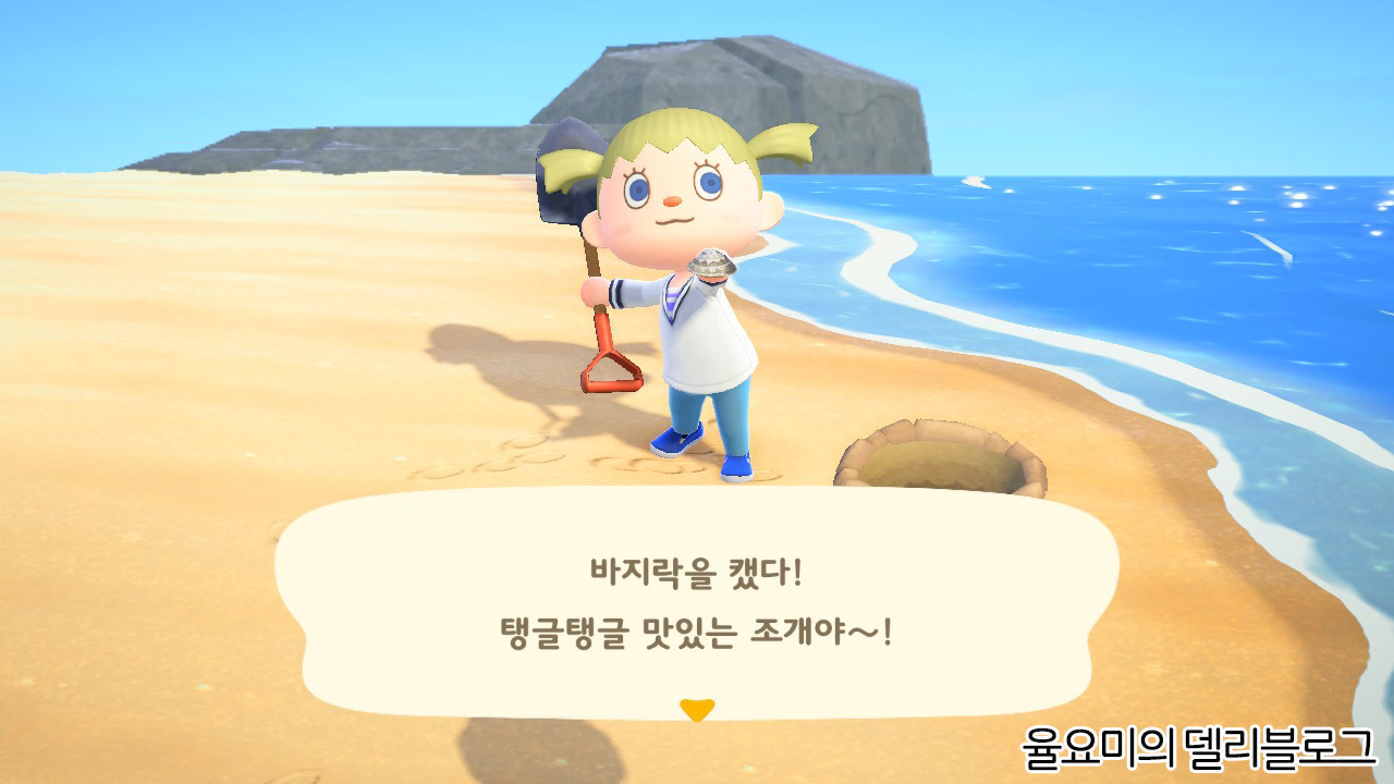해변가를 걸어다니다 보면 작은 검은 그림자와 함께 물을 뿜는 것을 볼 수 있는데 삽으로 꺼내게 되면 바지락을 캘 수 있습니다. 바지락은 물고기 낚시에 필요한 떡밥의 재료가 되며 바지락을 처음 구하게 되면 물고기 떡밥 레시피도 얻을 수 있습니다. 떡밥으로만 잡히는 물고기들도 존재하기 때문에 바지락을 모아 떡밥을 만드는 것이 좋습니다.