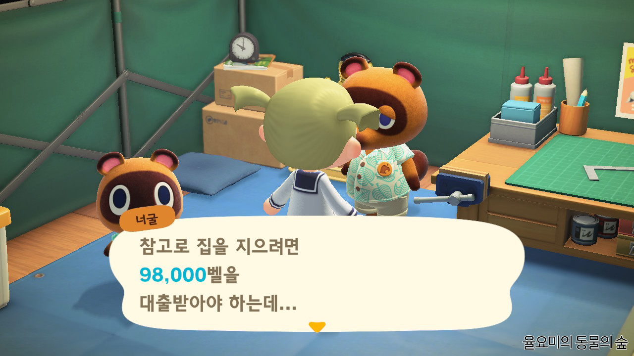 튀어나와요 동물의 숲과 마찬가지로 98000 벨이 필요하다. 낚시하고 곤충채집도 하면서 열심히 모아야지...! 무튼 마음먹었으니까 우리 집 잘 부탁해 너굴씨.