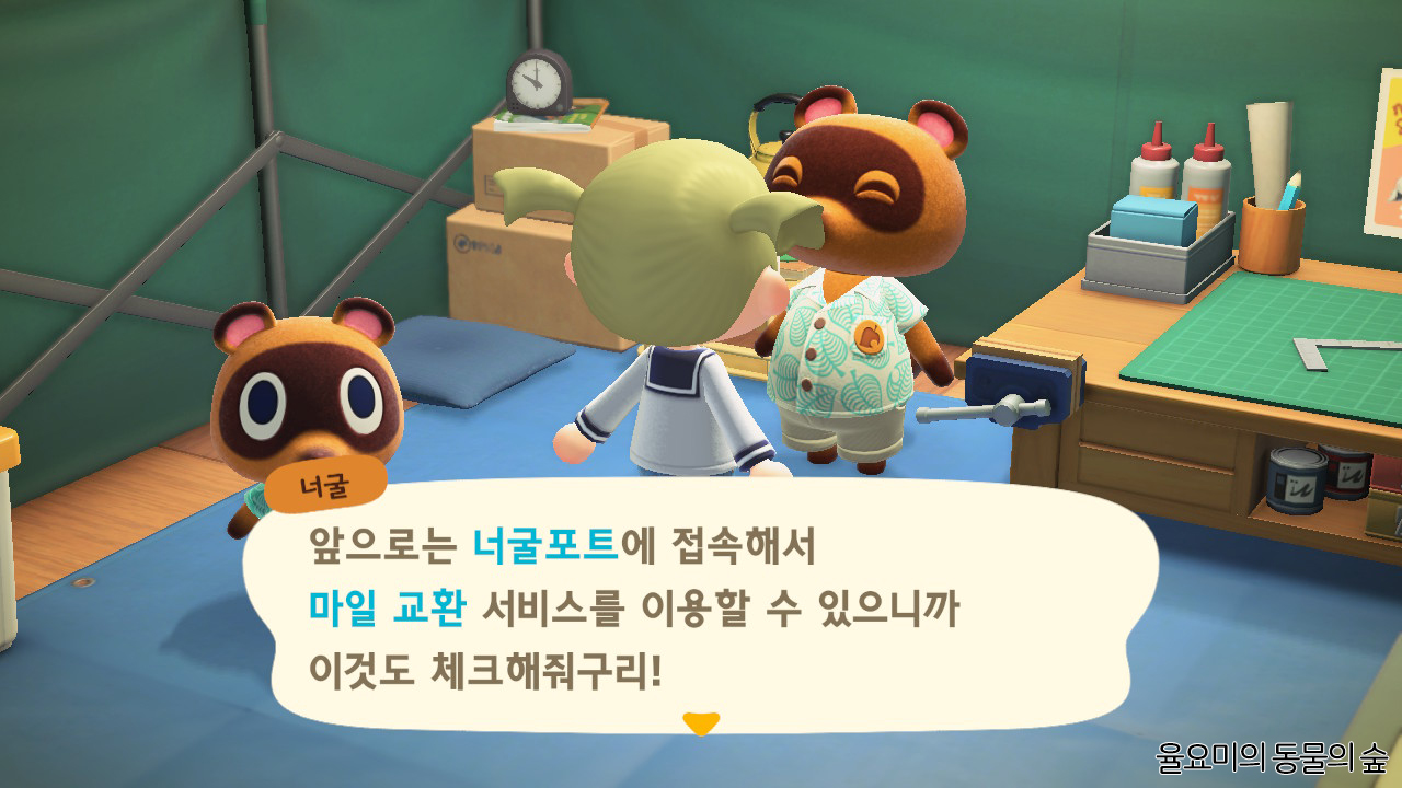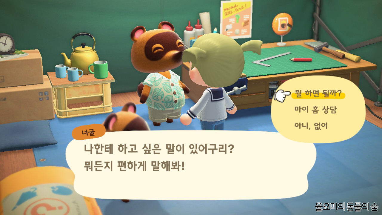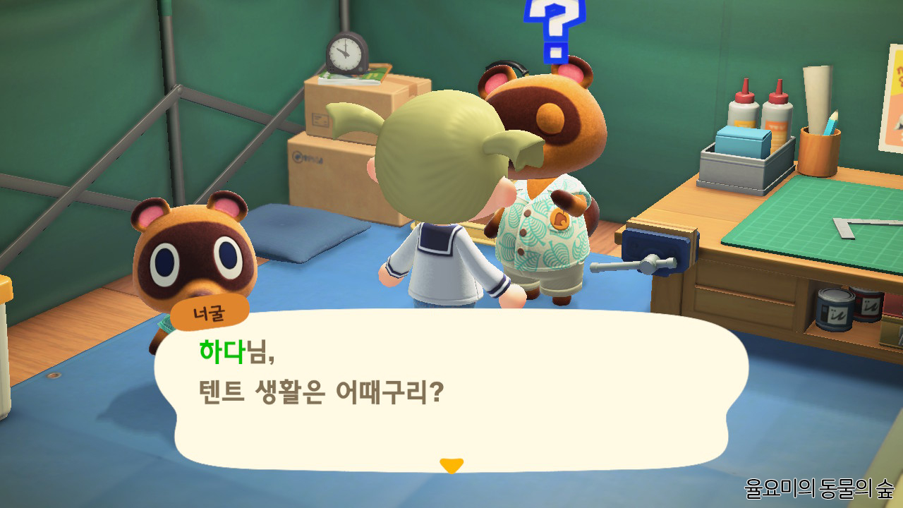 너굴이가 텐트 생활은 어떻게 되어가고 있냐며 물어본다. 근데 생활한지 하루도 안되어서 큰 불편함은 없는데 게임 진행을 위해선 업그레이드를 해야겠지? 사실 내가 마을 꾸미기나 집 꾸미기나 큰 관심이 없는 편이다.