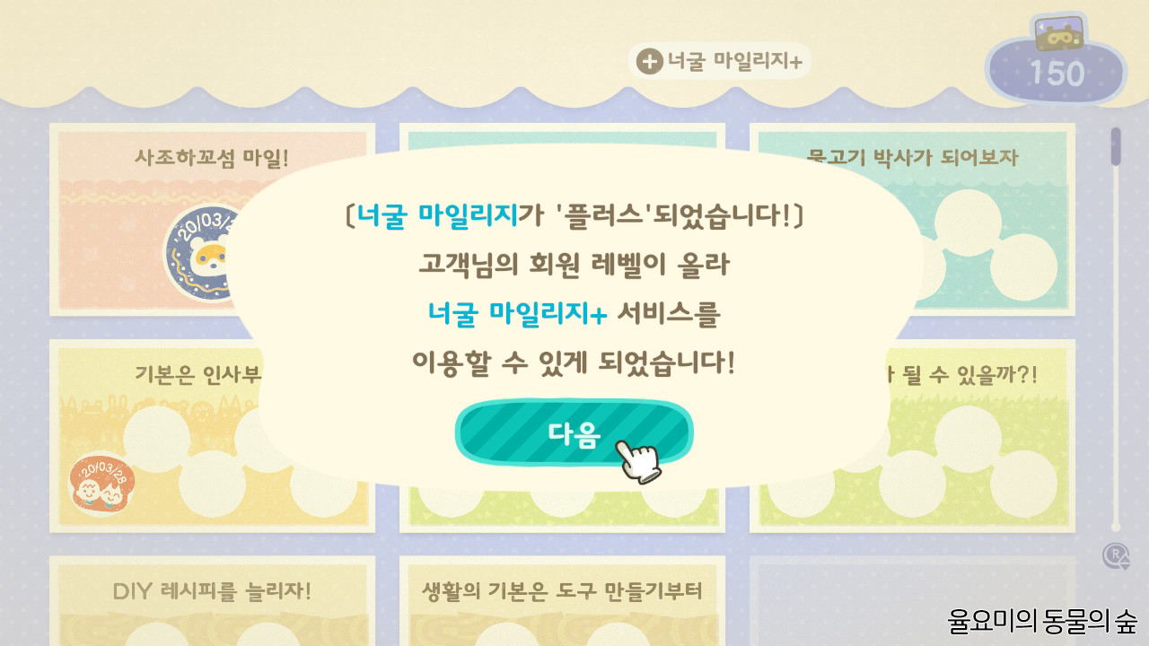 업그레이드된 너굴 마일리지 플러스! 특별한 조건을 달성하면 추가 마일을 받을 수 있는 특별한 프로그램이라고 한다. 마일 티켓 교환이나 마일리지로 살 수 있는 아이템들 쇼핑을 하려면 마일리지가 많이 필요해서 모으기가 쉽지 않겠다 싶었는데 이렇게 업그레이드를 해준다니 다행이다 싶었다.