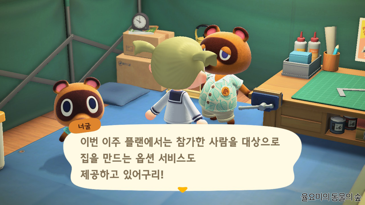 나에게 텐트 사용이 불편하다면 너굴이가 주최한 이주 플랜에서 집을 만드는 옵션 서비스도 제공한다고 한다.