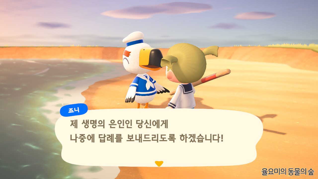 죠니가 하는 말들을 들어보니 배를 타고 가다가 바다로 떨어졌다고 한다. 깜박 졸다가 그랬다는데 졸음운전은 정말 무서운 거란다. (뜬금없지만 이게 바로 졸음운전을 해서는 안 되는 이유입니다!) 그래서 내가 너에게 도와줄 일은 뭐니? 어서 말을 해보렴!